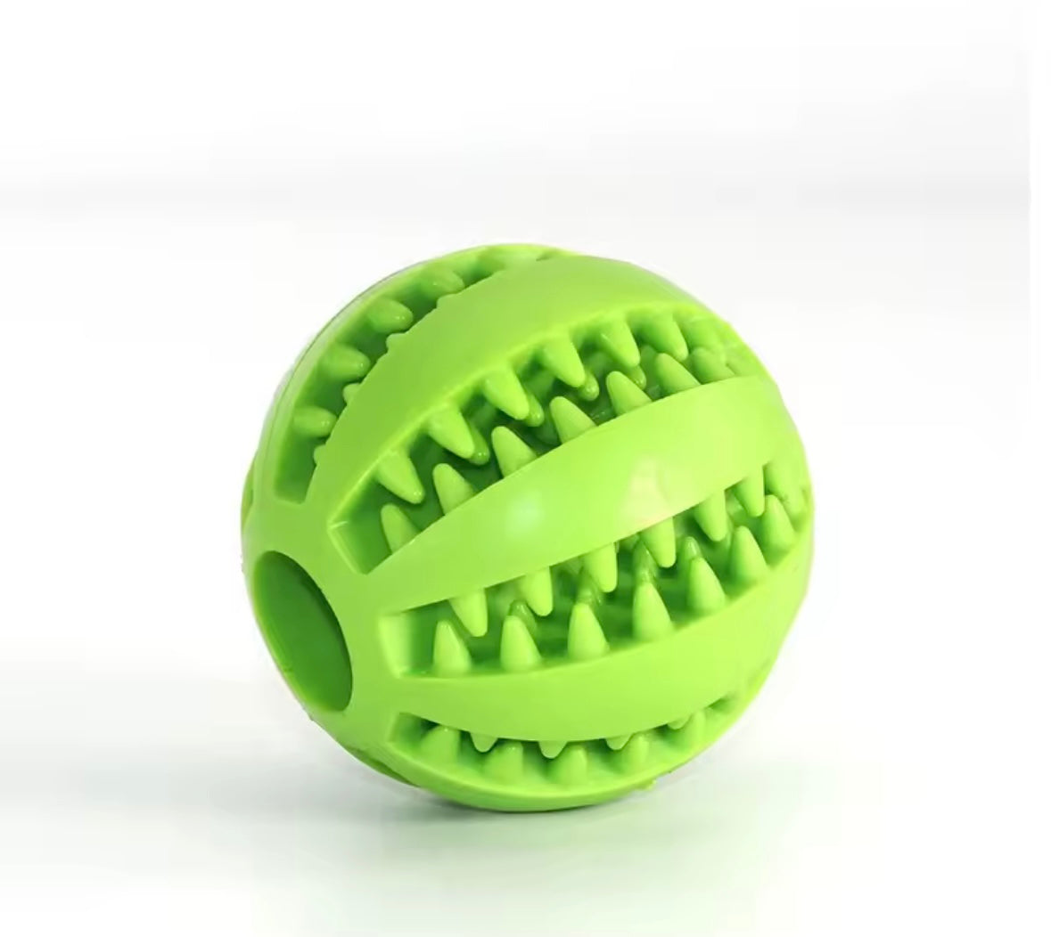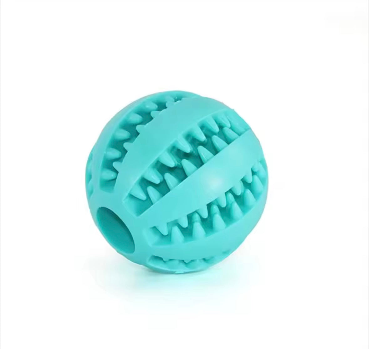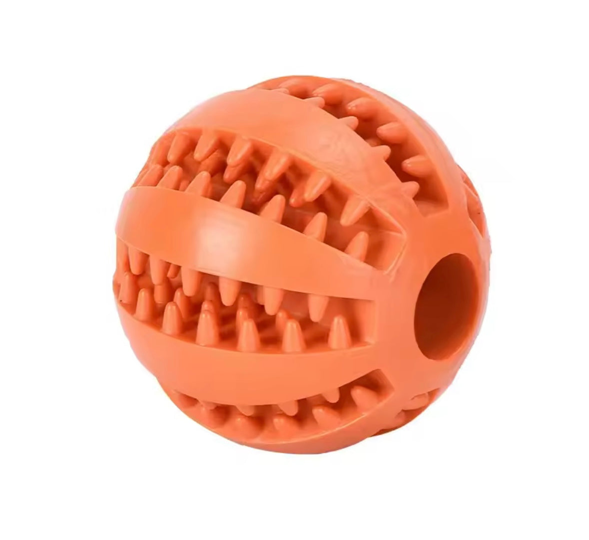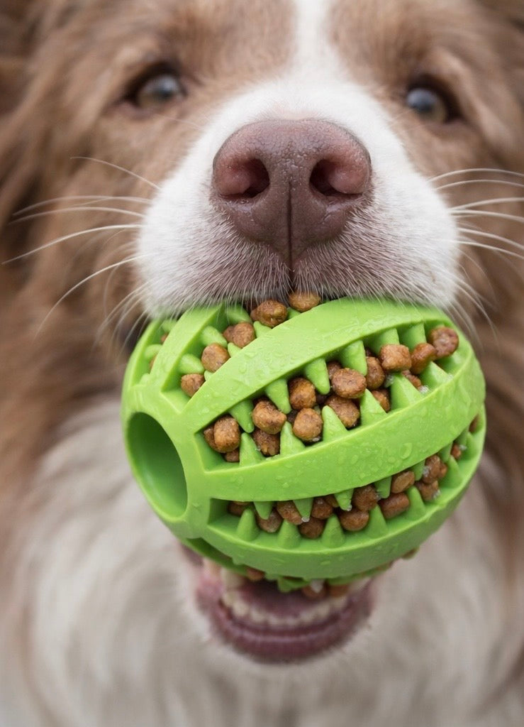 La forma sferica con fasce incrociate e rilievi morbidi permette di inserire croccantini o snack negli spazi laterali, stimolando il cane mentalmente e prolungando il tempo di gioco.